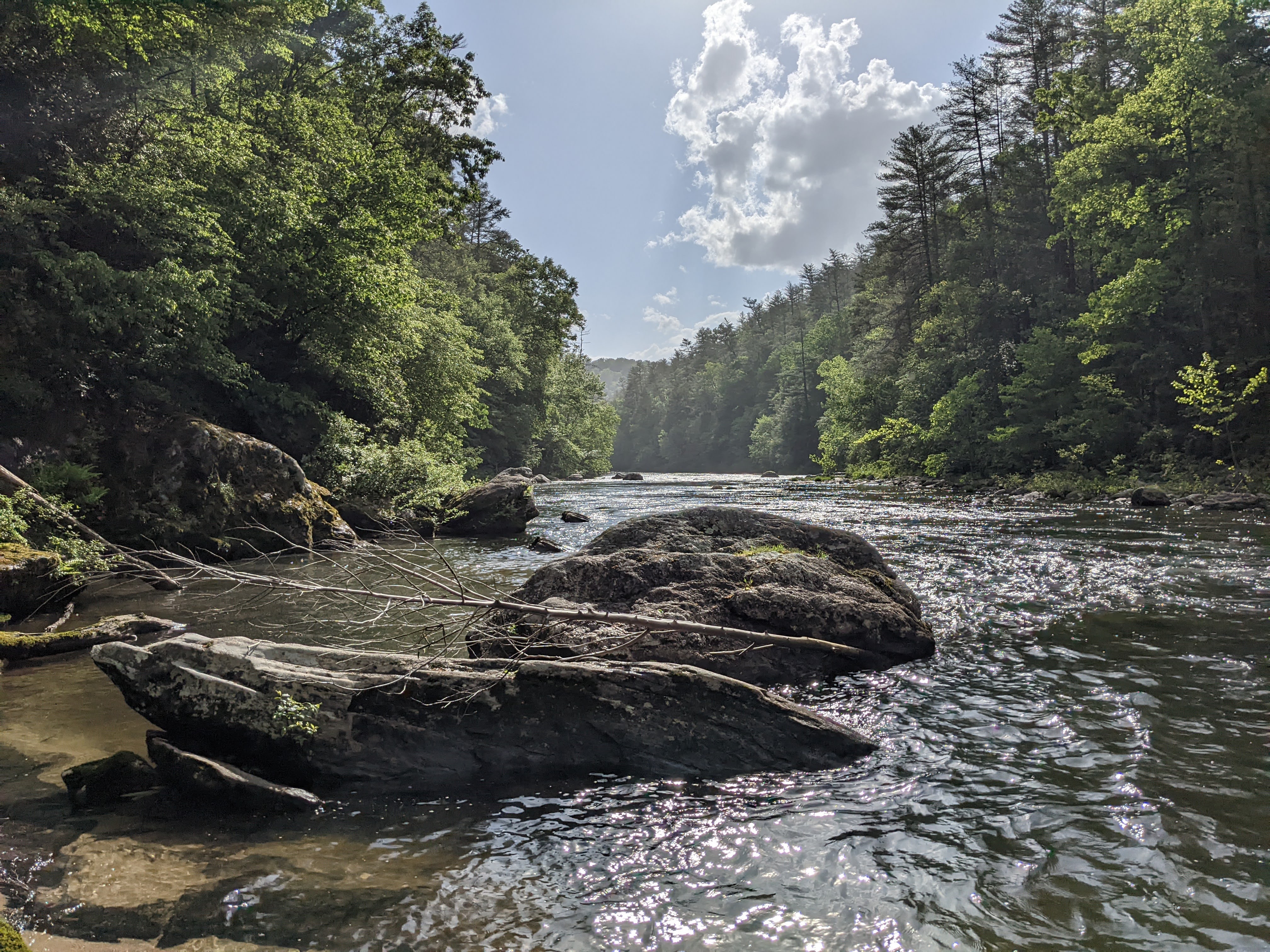Section 3.5 of the Chattooga culminates with the notorious Bull Sluice rapid, and owing to its easy access from the highway, attracts many spectators. We had a few hours on the raft to get used to each other and learn how our captain commanded the raft before we tackled The Bull. Before we ran it, we beached the raft and got out to go look at the rapid and come up with a game plan for navigating it. Clayton told us what the plan was and we all knew what was expected of us. We got back into the raft and shoved off the shore and into the mainstream. My heart rate was through the roof and I was both nervous and excited. We took basically the line we wanted to but somehow got pushed sideways during the first part of the two part descent (this is not ideal) but managed not to lose anyone during the second drop. Lots of cheering and high five’ing happened after we ran the rapid and the ensuing adrenaline rush was intense!