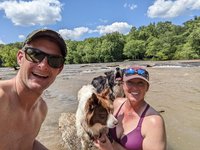 The Saluda river is right in between my apartment and Scott’s house so we took advantage of its proximity and enjoyed a few canoe trips to “Ant Island” with the dogs and a few trips down it on tubes. The dogs have turned into excellent canoe passengers and get excited about paddling with us. Ollie likes to bite at the water coming off the oars and Andi likes to stalk things from the comfort and safety of her vessel. It can be squirrely when they both decide to move around the canoe at the same time but the more often we take them out, the better they are getting at being still and sometimes will even lie down. Andi’s confidence level swimming has increased since we got her a doggy life vest. Although she still needs some coaxing, she is now more comfortable swimming back and forth between Scott and I. She enjoys investigating the little island and Ollie loves standing in the water, smacking, splashing, and barking at it.