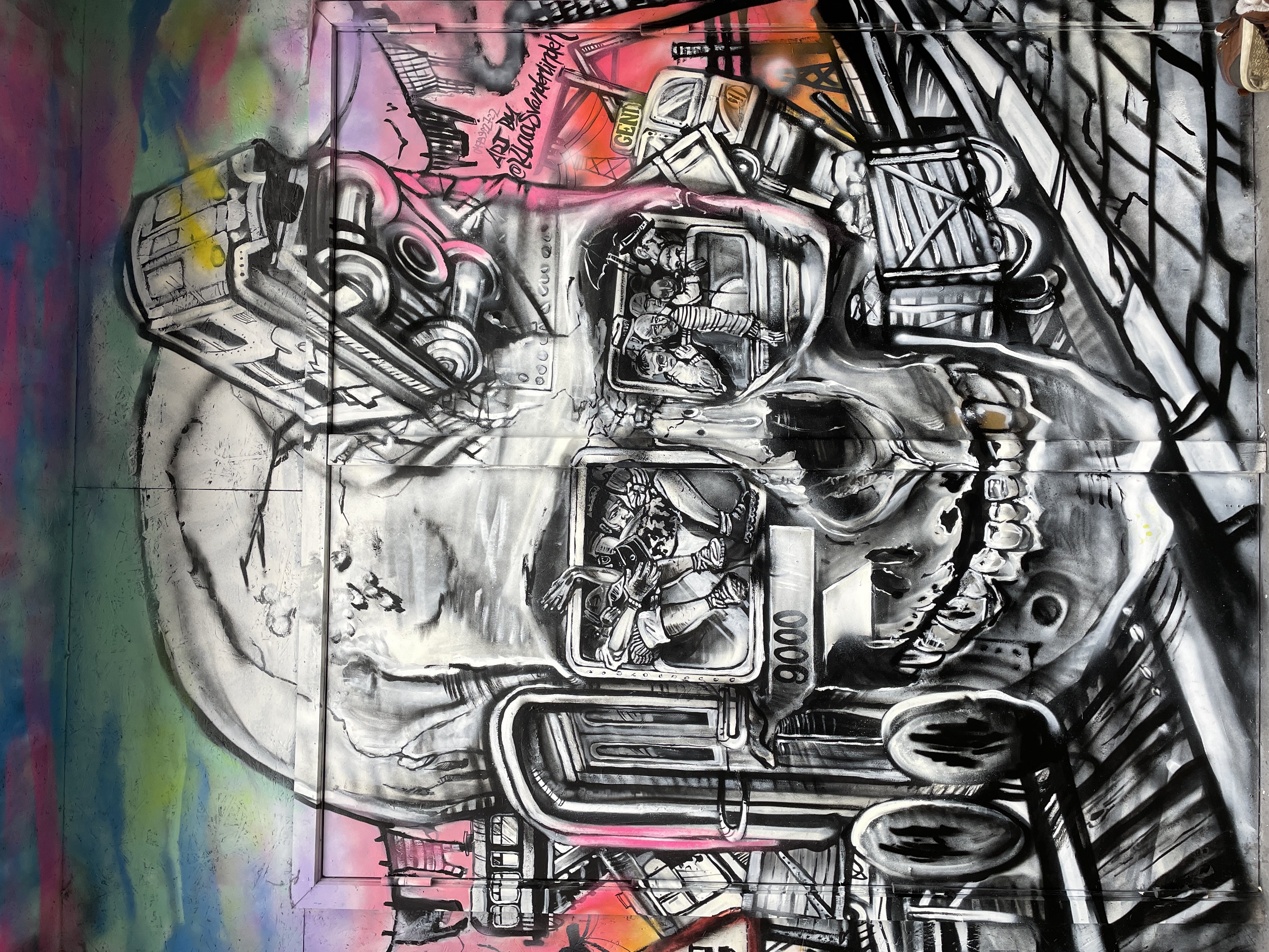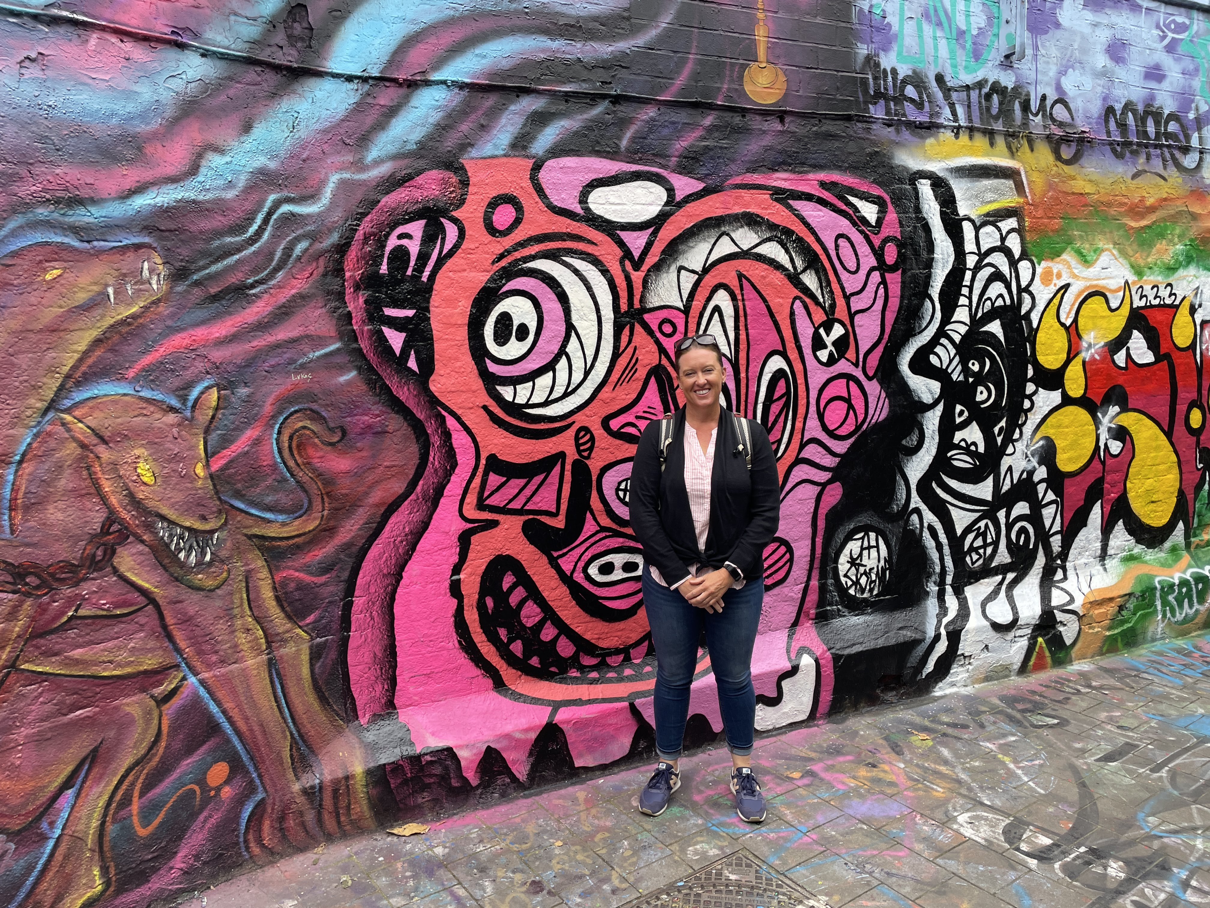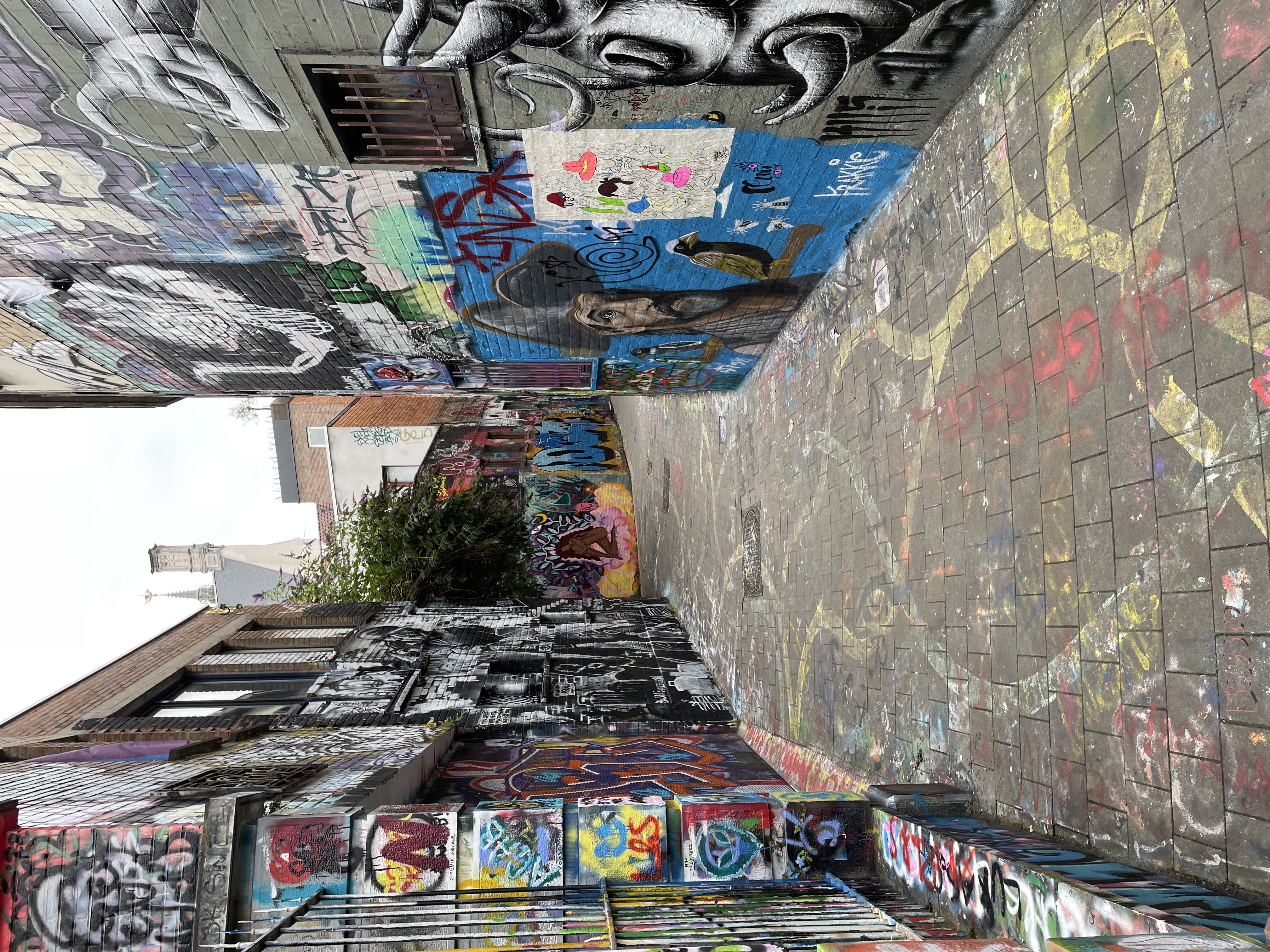 Our apartment looked directly down on an interesting Ghent feature: Graffiti Street, so that was our first stop. Graffiti Street is a short alleyway where graffiti is both allowed and encouraged and the only rule that applies is the “rule of the spray can” which evidently means you shouldn’t paint (paint? Or would it be draw? Maybe spray?) over works that are better than yours and don’t be noisy late at night and disrupt the local residents. It was a wild thing to see and we enjoyed seeing the creativity and talent of some of the artists. The paint that has accrued on the buildings in the alley since Graffitti Street was born in 1995 must have been close to an inch thick.