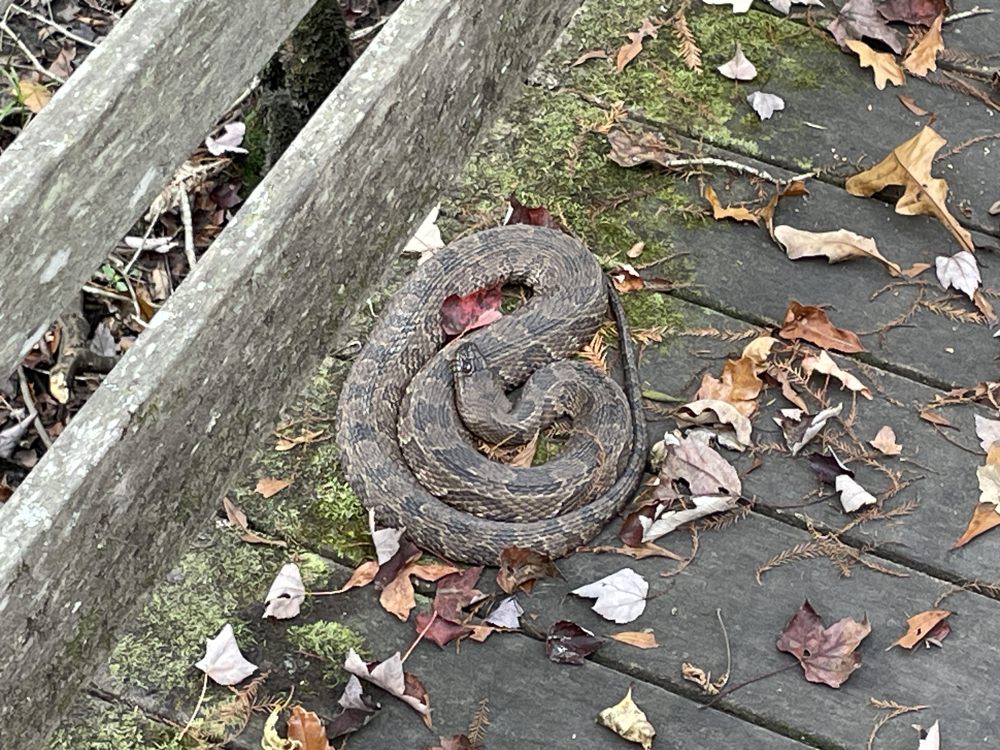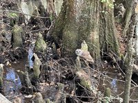 On our way back to the visitor’s center an employee appeared on the boardwalk about 50 yards in front of us and very calmly but firmly announced for us to stop because there was a water moccasin somewhere between us and him. We didn’t have to be told twice and stopped in our tracks, heads on a swivel. Snake stick in hand, the employee inched forward along the boardwalk in search of the snake. What he found (about 10 yards in front of us) was a nonvenomous, shy, and very common, brown water snake. A visitor that had passed by her previously had made the common mistake of misidentifying her. He invited us up to her and pointed out the features that often get them confused with water moccasins (a long mouth which enables them to grip onto fish gives them more of a triangular head which people mistake for a venomous snake as well as their shorter and wider body). She seemed nonplussed by our impromptu nature class and lay politely coiled so we could learn about her. The employee decided she was fine where she was and didn’t need to be shooed off the boardwalk since the center was about to close for the day. We headed back to the car and plugged in Becky’s address into the GPS.