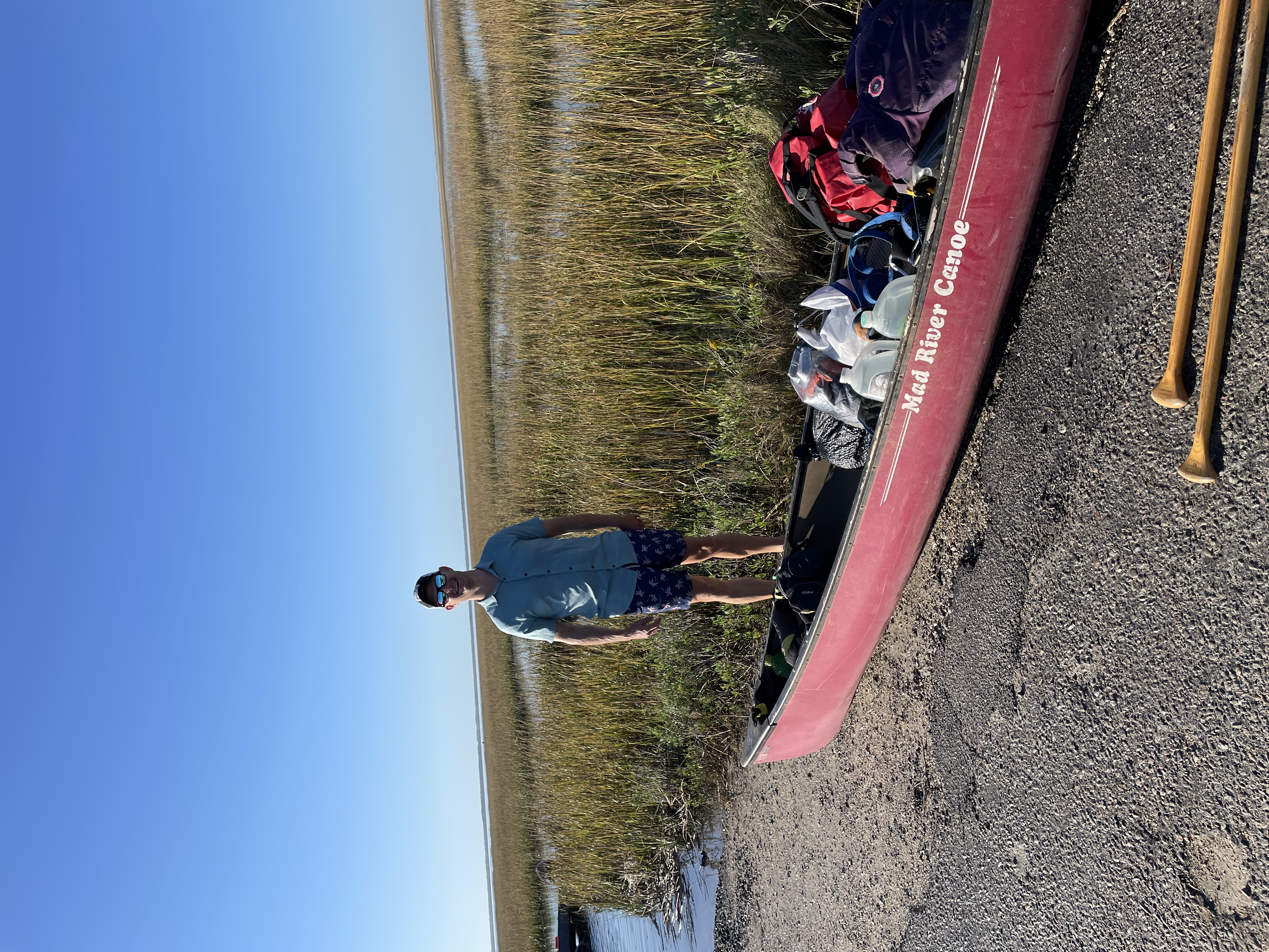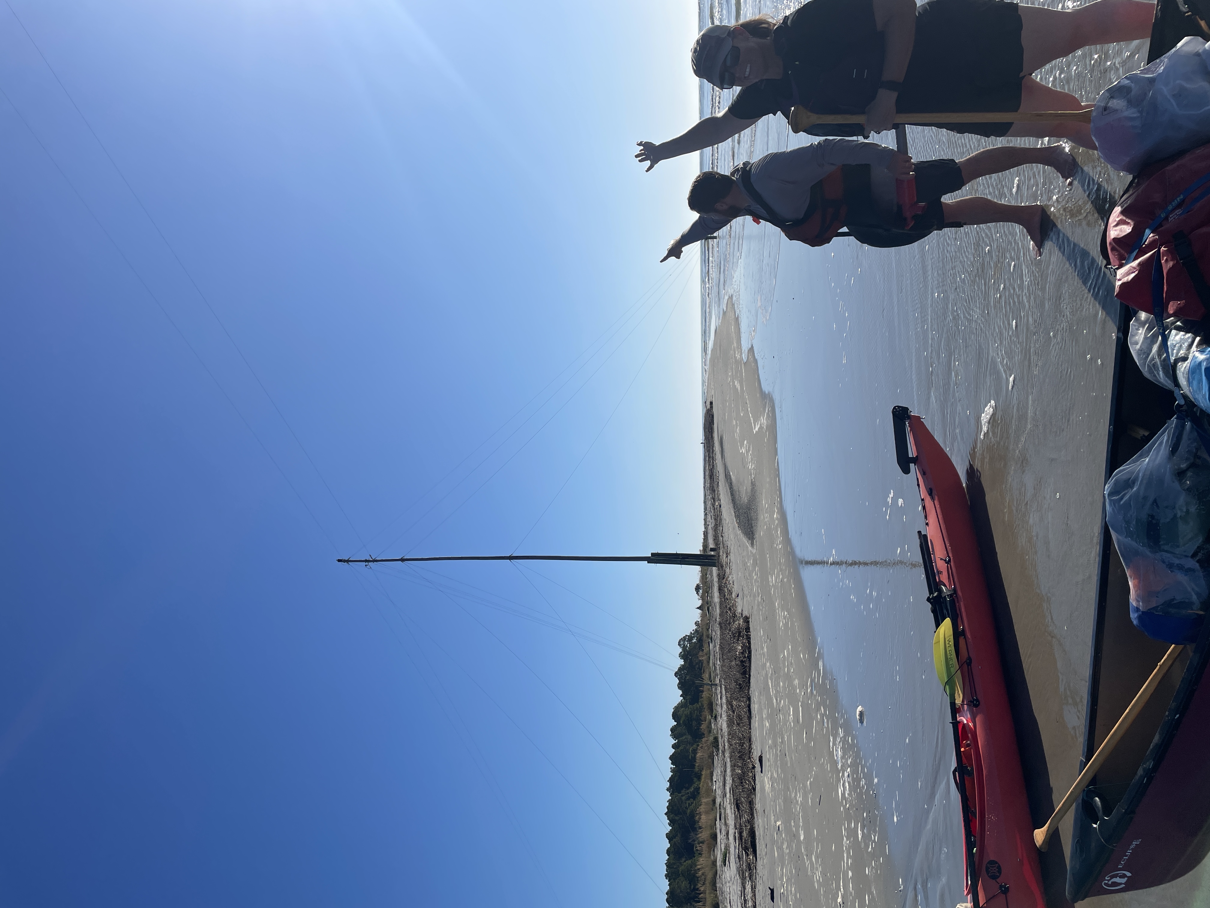 Everything was covered in sand and the mosquitos were still out in full force which made packing less than enjoyable but we got it done. We decided to hand walk our boats to the end of the island to avoid the breakers that were assaulting us as best we could which was still quite the task. The waves were determined to knock us off our feet and swamp our canoe and Joey didn’t have that much of an easier time. When we got around the corner of the island to the calmer channel, we beached the boats to bail them out. Thankfully both Joey and Scott had good bilge pumps and we were able to get enough water out to make them usable again. As we were pumping out the boats we spotted a bald eagle on a telephone pole near us, seemingly gazing down on us and watching what we were doing. A few minutes later another one flew by it and they vocalized to each other. (They don’t sound like TV and the movies make them sound like- they are much more high pitched and whistley. Fun fact- usually the sound you hear them making on TV, commercials, or movies is actually a red-tailed hawk call dubbed over their own calls.)
