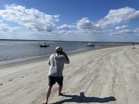 We loaded our boats and were ready to depart. The paddle out to the island took just a little over an hour to make because the tide was outgoing and carried us helpfully along with it. Right after crossing over the Intracoastal Waterway channel (we had to paddle swiftly because there were commercial shrimp boats trolling this watery interstate) we were treated to a dolphin sighting. It breached just a dozen or so yards in front of us- so close that we could see its dark eyes, the shimmer of its smooth gray skin, and hear the expelling of water and subsequent intake of breath through its blowhole as it glided through the water and up to the surface.