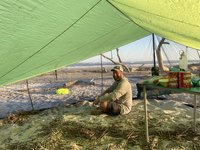 The brightening sky awoke us the next morning and we were all outside of our tents to witness the sun break spectacularly over the Atlantic ocean horizon. Seeing the sunrise through the limbs and trunks of the dead trees of the boneyard was quite a sight. Once it started to rise it dramatically climbed higher and higher. The mosquitos were ready and waiting for us again so we escaped into the Bugout tent again for our coffee and breakfast. After breakfast it was time to break down our camp and pack up because we needed to catch the high tide for the paddle back out to the mainland.