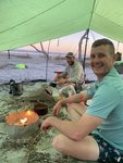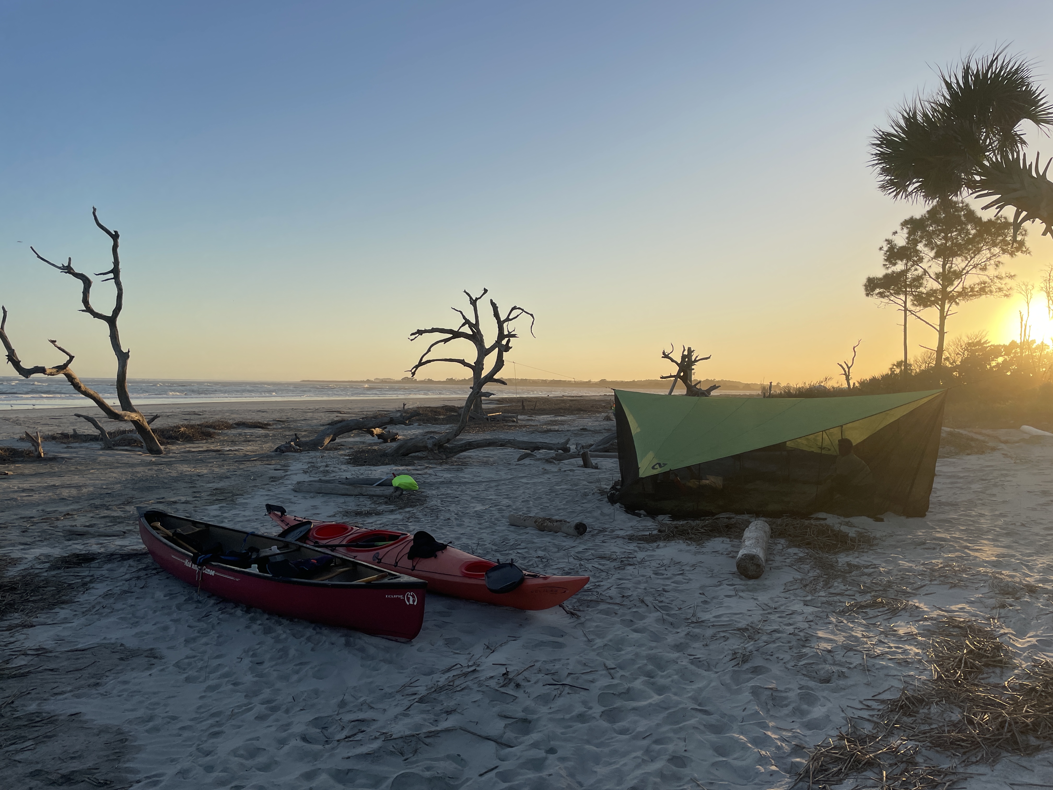 We had been advised by some campers already on the island to avoid the wooded area because the mosquitos were worse there because of the vegetation. Scott and I picked an area that was above the high tide line and not too close to the woods and Joey found some trees a little outside the woods to hang his camping hammock. We did a quick camp setup and then went to check out the “boneyard” beach which is an area of the island where the shore has been eroded away by the tides, winds, and hurricanes and have left dead trees on the shore. Some are still rooted and are in varying degrees of uprightness, and some are driftwood. At high tide the waves crash dramatically into the trees. The overall effect at either tide is a little eerie and looks like an abstract art exhibit.