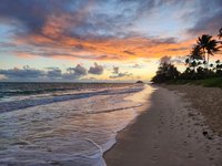 When Karen and I were finished testing we headed home to write up some of our test sheets and then we connected with Scott and we all headed to dinner. I of course had spotted the local brewery- Lanikai Brewing Company, and wanted to check it out. On the drive into Kailua we were treated to a blaze orange sunset as the sun dropped behind the moutains. When we got there we saw that it had a food truck outside and I gave Karen and Scott the option of going somewhere else. They were good sports about it and said they didn’t mind. All the brewery’s beers were their own and we each got something different. Scott wandered across the street and found a taco truck to order his meal from and while he was over there also found a local artisan selling bouquets and arrangements and he bought one to give our Airbnb hostess which I found quite sweet. Poor Karen had forgotten her reading glasses so we got a good laugh over me having to read her the entire drink and food menu though, and she somehow ended up unintentionally ordering a flight of spirits that she shared with us. Scott regaled us with stories from his Three Peaks hiking adventure.