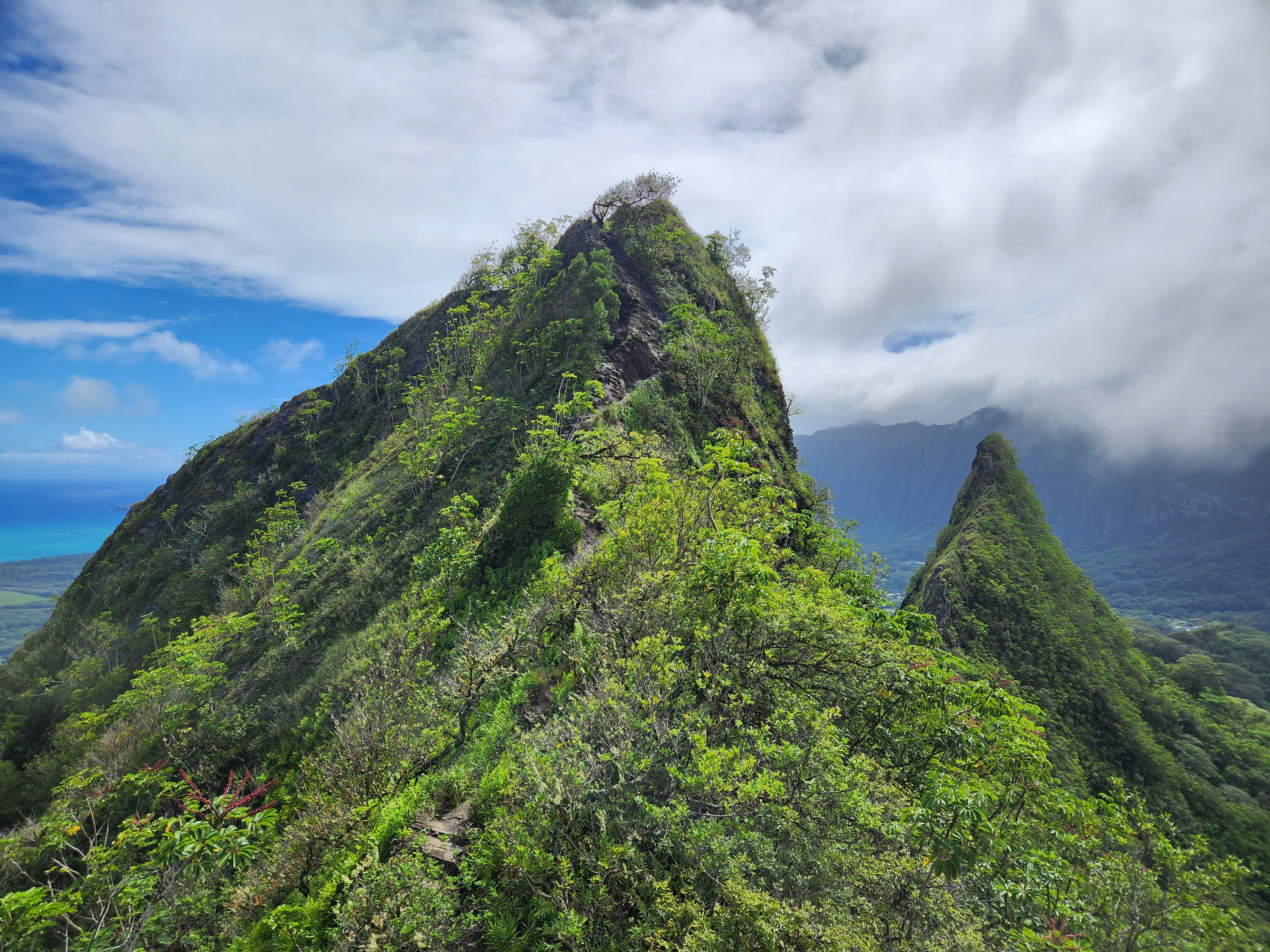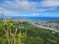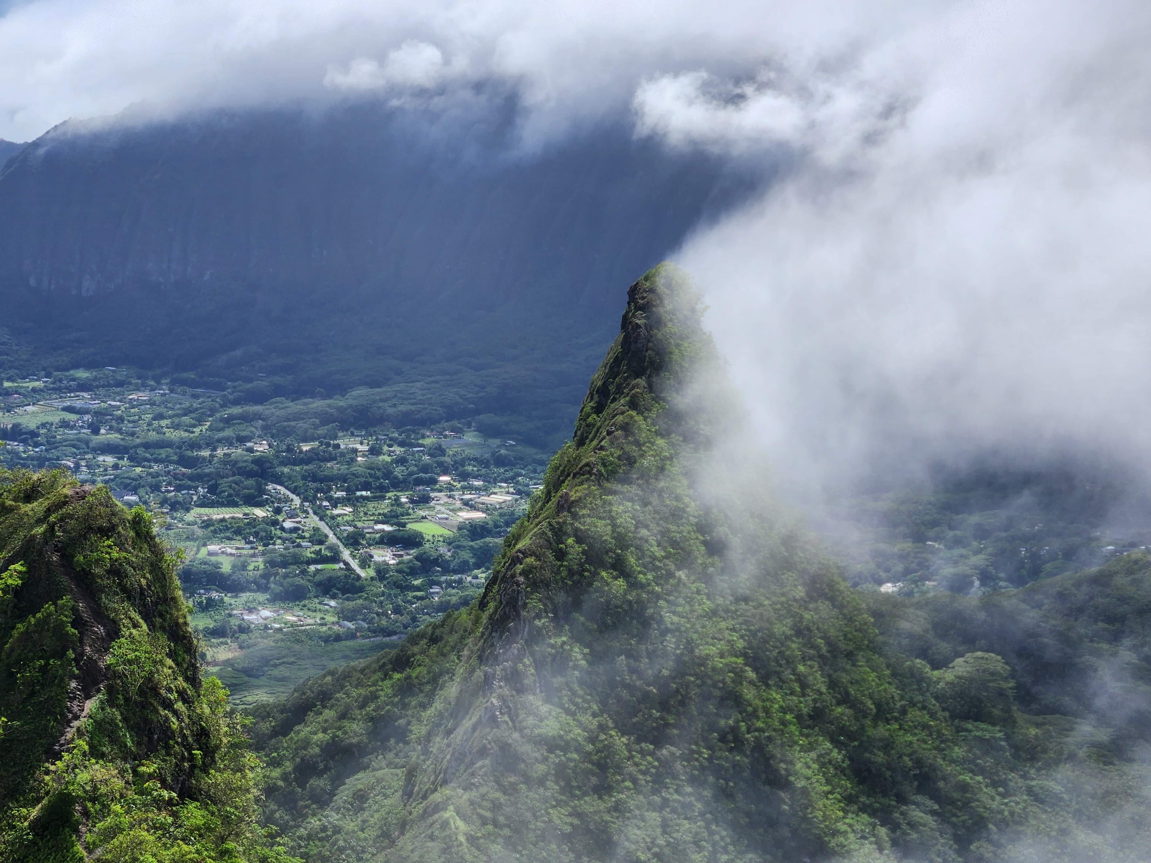 On the first day of testing Scott planned to hike Mount Olomana or Three Peaks (the hike that the Airbnb owner had warned him about) and it turns out that its trailhead was less than a half mile from Maunawili Farms. In fact, I had a view of it from the farm while Karen and I were testing. He both survived and enjoyed the hike and thankfully only did the first two peaks, avoiding the third and most dangerous. It was fairly steep and slick with mud (so much that when he got back to the Airbnb he got into the shower fully clothed to wash off his clothes!) and there were permanently affixed ropes along the way to help navigate the trails, but the spectacular panoramic view of Oahu at the top made it worth it. At the second peak he was even able to hang his hammock and enjoy a siesta atop the mountain.