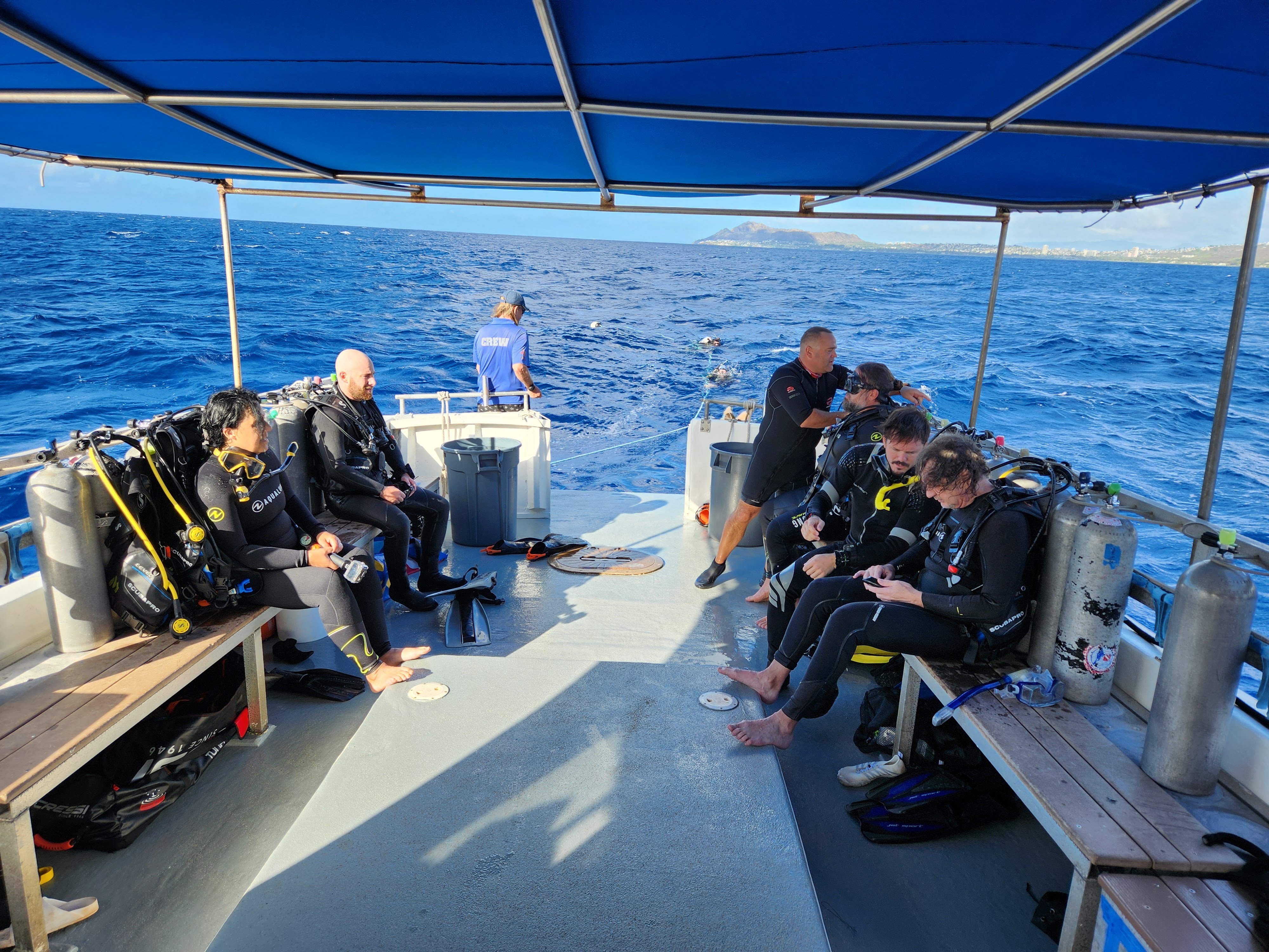 Scott here! After much research, I found a dive shop in Honolulu called “Island Divers” that was much closer to Kailua that had a dive charter package that worked with our schedule. It provided three dives on one charter, all in nearby Maunalua Bay. The first dive was at a crashed Corsair airplane at about 115 fteet. The plane had gone down in the 1940’s (the pilot was ok). The water was warm and the visibility was good so I was able to explore the decayed and coral covered wreck for about 40 minutes and saw lots of schooling fish that were attracted to it. The next dive was only about 15 minutes away and we sat around talking and waiting until we had an appropriate surface interval before we dove again. The second dive was called New Barge and was eventful because we saw a six foot long whitetip reef shark swimming along the ocean floor. It was another short boat ride to the next dive site which was a drift dive which means the boat drops you off and you let the current push you along. We drifted along a shallow coral ledge at about 40 feet and saw two moray eels and some puffer fish. We got back early afternoon and from there I headed to Waikiki where I did a little hammocking and walked along the beach. While hammocking, I called a small kayak outfitter that I had found and arranged to rent a two-person sea kayak so that we could kayak later in the week. On the way back I stopped at China Walls and jumped off of its cliff and swam. I’m handing it back to Janna now.