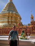 We saw a somewhat homemade looking sign to Doi Suthep and followed the path it was indicating, but we noticed that there weren’t many (and eventually, any) other people on it. For a moment we thought that we might be falling victim to another “common scam in Thailand” where an enterprising con artist has their own entrance to a temple or other point of interest and charges admission, when it turns out that there is actually no admission charge. But we carried on because Scott spied some derelict and somewhat looking abandoned steps in the distance that appeared to go to the temple. We survived the stairs, huffing and puffing our way up the steep ascent, and then all of a sudden we were inside a monastery and saw that we were at a side entrance to the temple. The monk who we surprised did a double take and then gave us a smile and a thumbs up; evidently he approved of our backroads sneak route to the temple.
