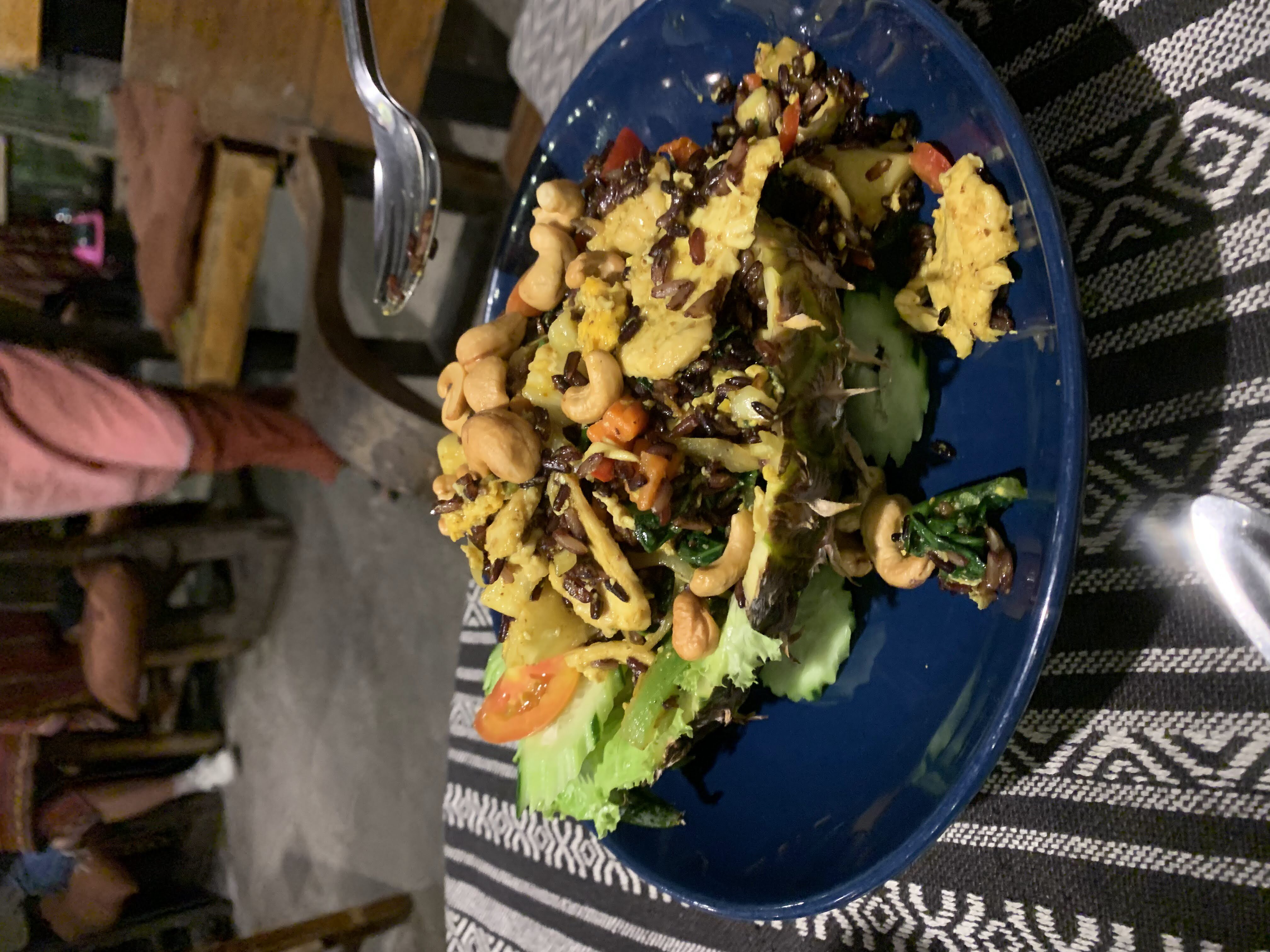 We had decided to try out Tikky Cafe for dinner, based on the recommendation from American travellers that we had met on our first night in Chiang Mai. We chose to walk the 3.5 km there to see more of the city. Along the way we passed a “Women’s Massage Center by Ex-Prisoners” and were perplexed as to what the heck that meant. Massages only for women? Or by women? Women “ex-prisoners” I suppose? So many questions. (Ahh, a quick Google search reveals that it is staffed by women who were formerly incarcerated and received vocational Thai massage training in prison.) We reached the restaurant and sat outside to wait for a table because it was quite crowded (always a good sign).