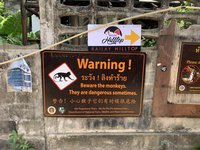 We retraced our steps and eventually reached an intersection near a floating dock and another spot where longtail boats and some other larger boats were dropping passengers off. We saw several areas where rock climbing lessons were taking place and while watching that, had our first monitor lizard and monkey spotting! The macaque monkeys would jump out of trees and land with a huge “thud” on the rooftop of the bathroom, before scrambling into the overhanging trees and climbing up the mountain. (Being inside the bathroom building while they were doing this was rather interesting and quite loud!)