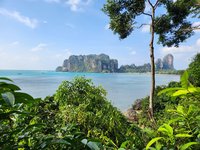 By the time we finally reached Phra Nang Cave and beach, it was pretty crowded. Luckily there was not as much boat traffic on this side of the peninsula so it was much quieter. We took a brief peak into the cave to see all of the, um, unique offerings that had been left in it, took the requisite pictures, and then ventured off in search of a good place to hang our hammocks along the beach. We had to take turns swimming again since this beach was a prime spot to have your stuff stolen. The water was a clear turquoise and was stunning. There was a sandbar that you could wade waist deep along that led you to one of the huge karsts that had its own sandy beach. We spent several hours enjoying the beach, thoroughly soaking in both the sun and the surreal scenery, before deciding to eat a bite for lunch overlooking the bay, and then catch a longtail boat back to Ao Nang.