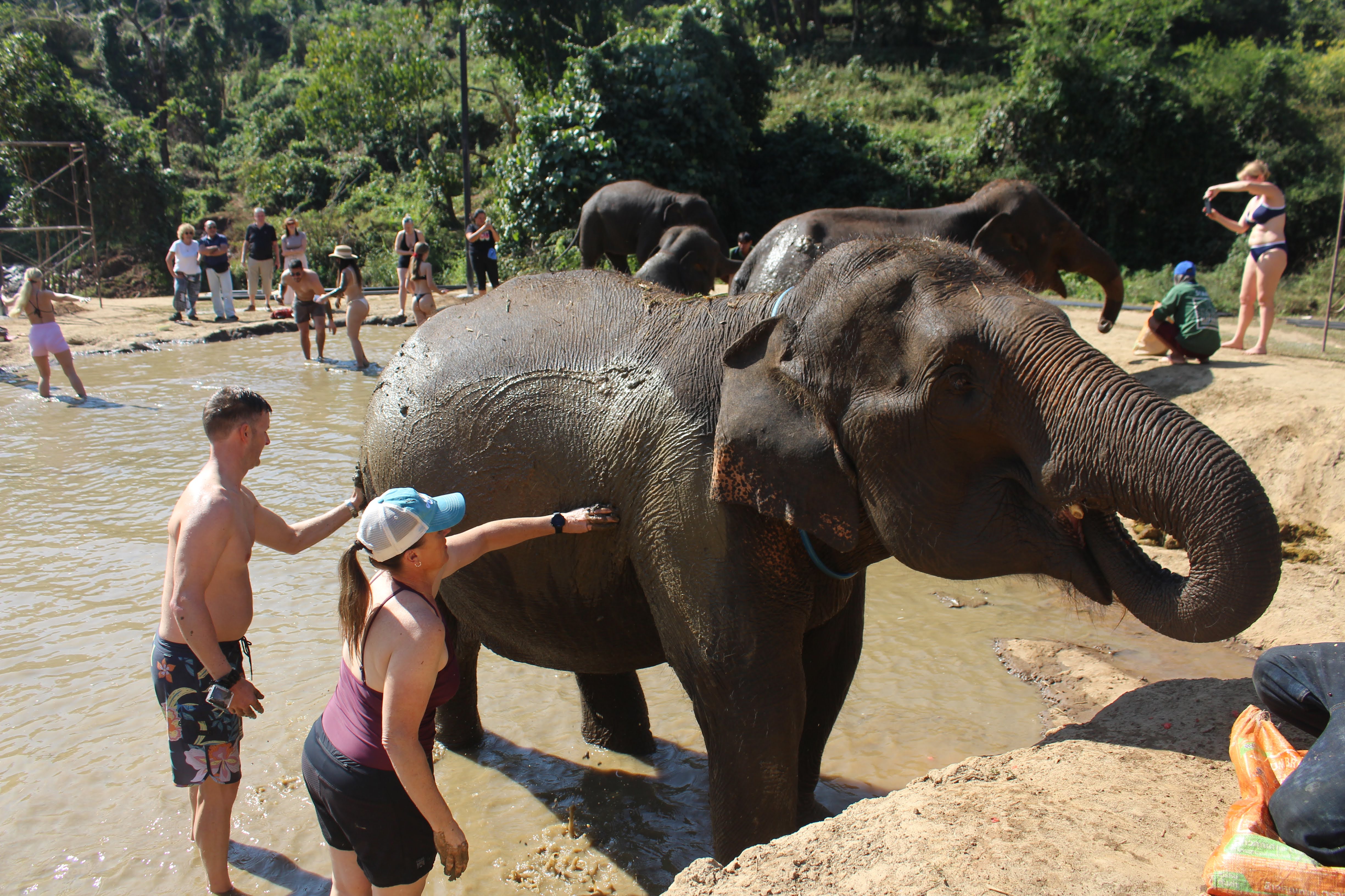 Author’s note: I had to pick my battles here. Through my research prior to our trip, I had learned that truly ethical elephant sanctuaries are touch free and do not let participants touch the elephants, only watch them from a comfortable distance. This means no feeding, no bathing, etc. While there has now been a movement to end elephant riding in Thailand, it is still technically legal, and many unsavory companies still offer it. However, there are many other ways that elephants are exploited for the entertainment of humans: logging, circuses, and even the activities that we did with them such as the feeding, and bathing. Elephants don’t need us to bathe and mudbathe them, and in fact, would probably prefer we not.
