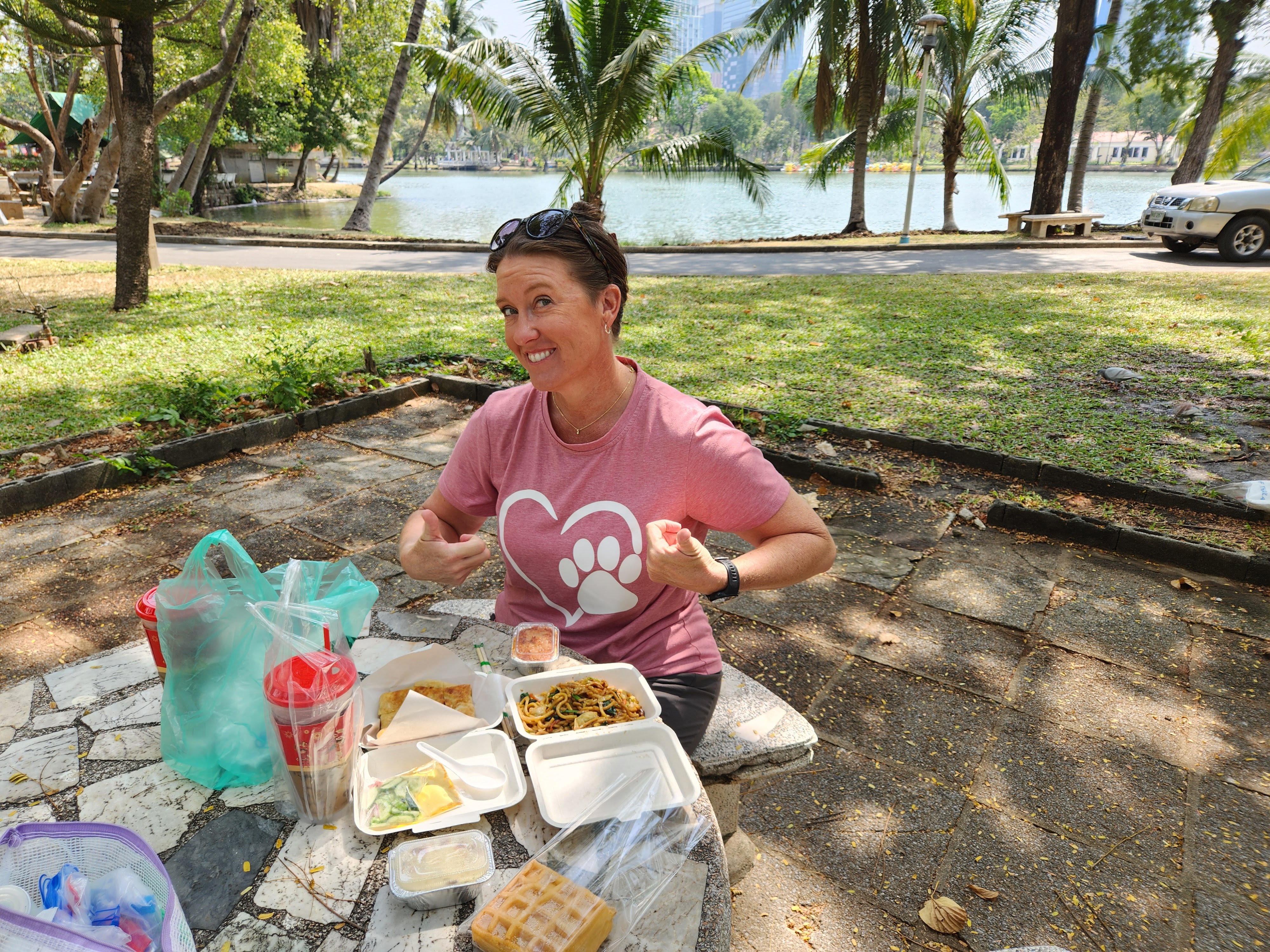 Our walk to the park took us through the beautiful Chulalongkorn University campus, or Chula University as it is more commonly known. The largest university in Thailand, its campus reminded us of a stateside school with its tree lined walkways, carefully tended gardens and lots of student activity. It hosts a medical school and we are hypothesizing that it’s because of this that the on campus outdoor food market that we visited gave the most nods to food handling safety that we had witnessed to date in Thailand. There might not have been any plastic gloves or hand washing going on but the vendors had erected a very crude sneeze-guard with saran wrap so there is that. Since this was our last day in Thailand we went a little crazy on buying Thai foods to try and got a little bit of this and a little bit of that from several stalls (all for just a few US dollars) to supply our picnic. I was hoping for some roti but unfortunately didn’t find any.