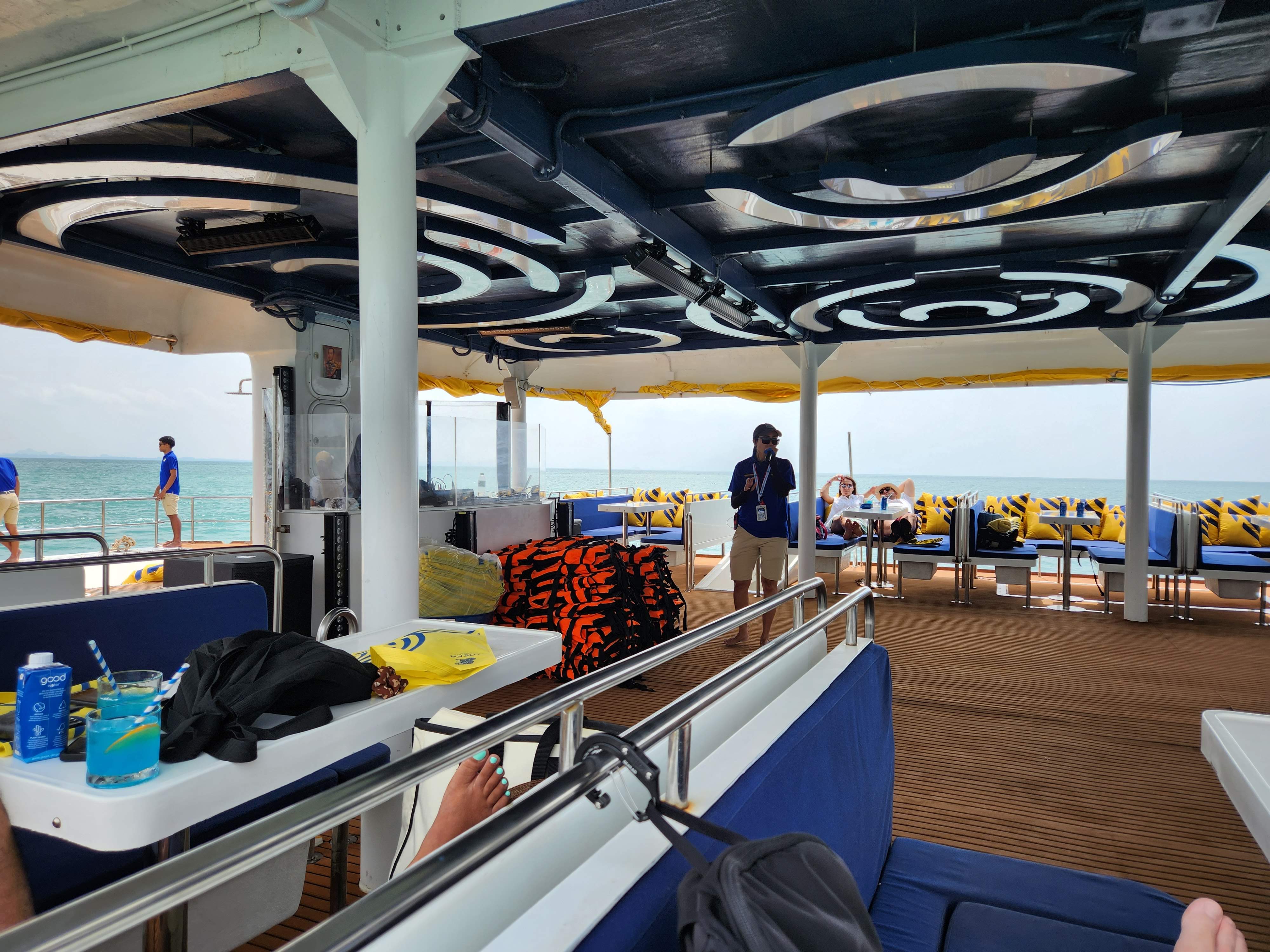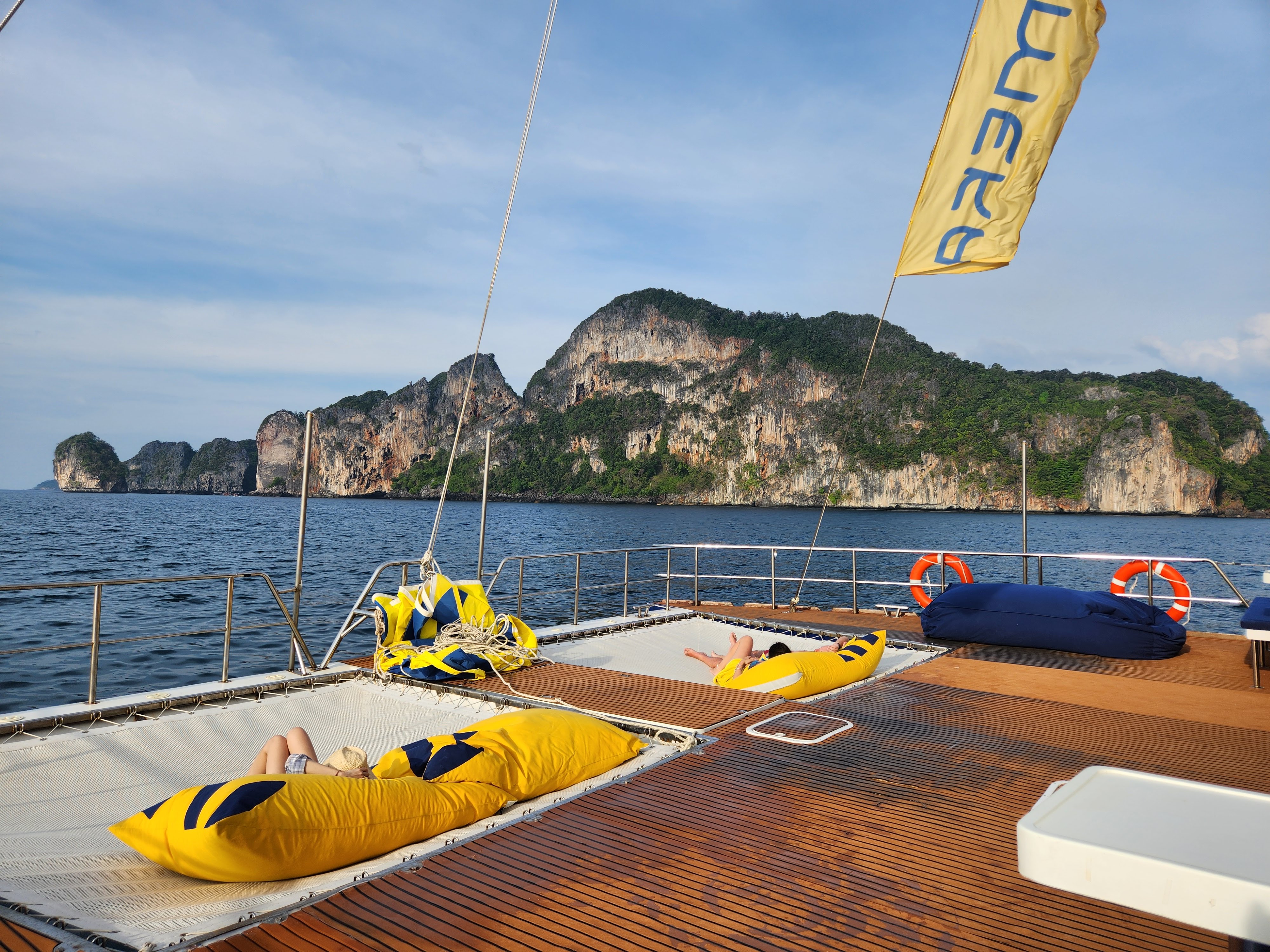The catamaran was just as luxurious as the promotional materials had promised and we were escorted to our assigned seats that were perfect for lounging and soaking up the sun (or shade if you got too hot) and given a welcome drink. The cushions and pillows and color scheme added a level of poshness and made for lovely photos… especially with the dramatic limestone karsts of the Andaman Sea in the background. We settled in before going to check out the rest of the boat. It had an upstairs that was similar to our deck and the front lounging area had several types of comfy seating in addition to its “trampolines,” and even had bean bags that could be taken onto them.