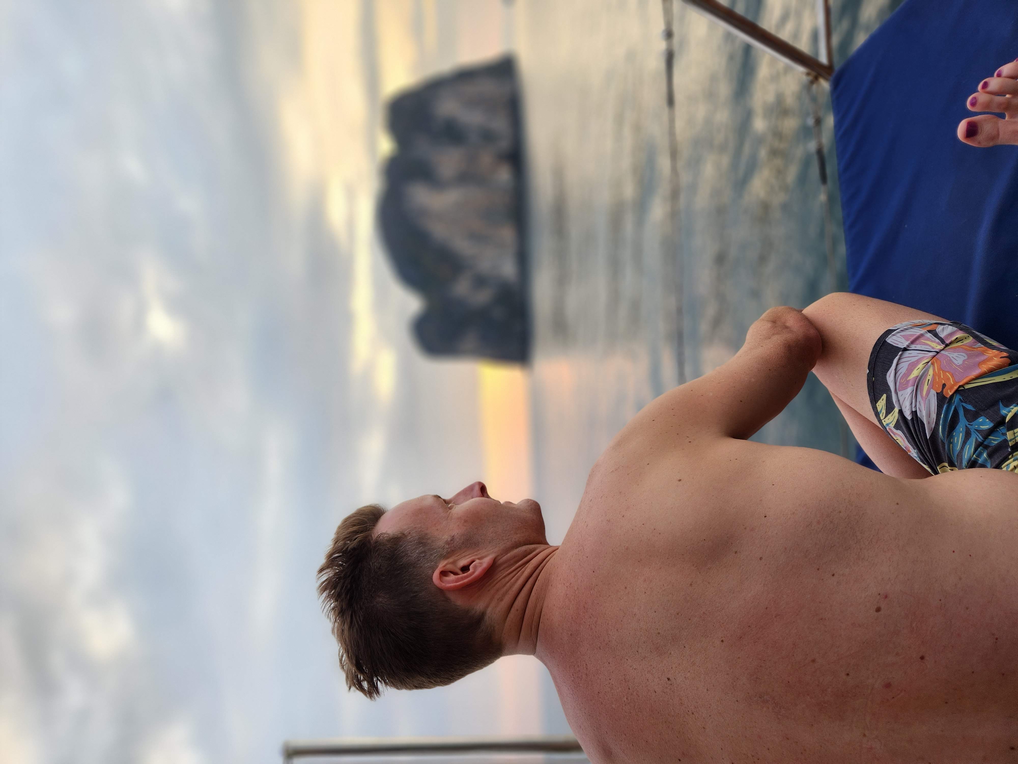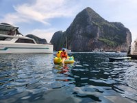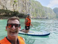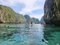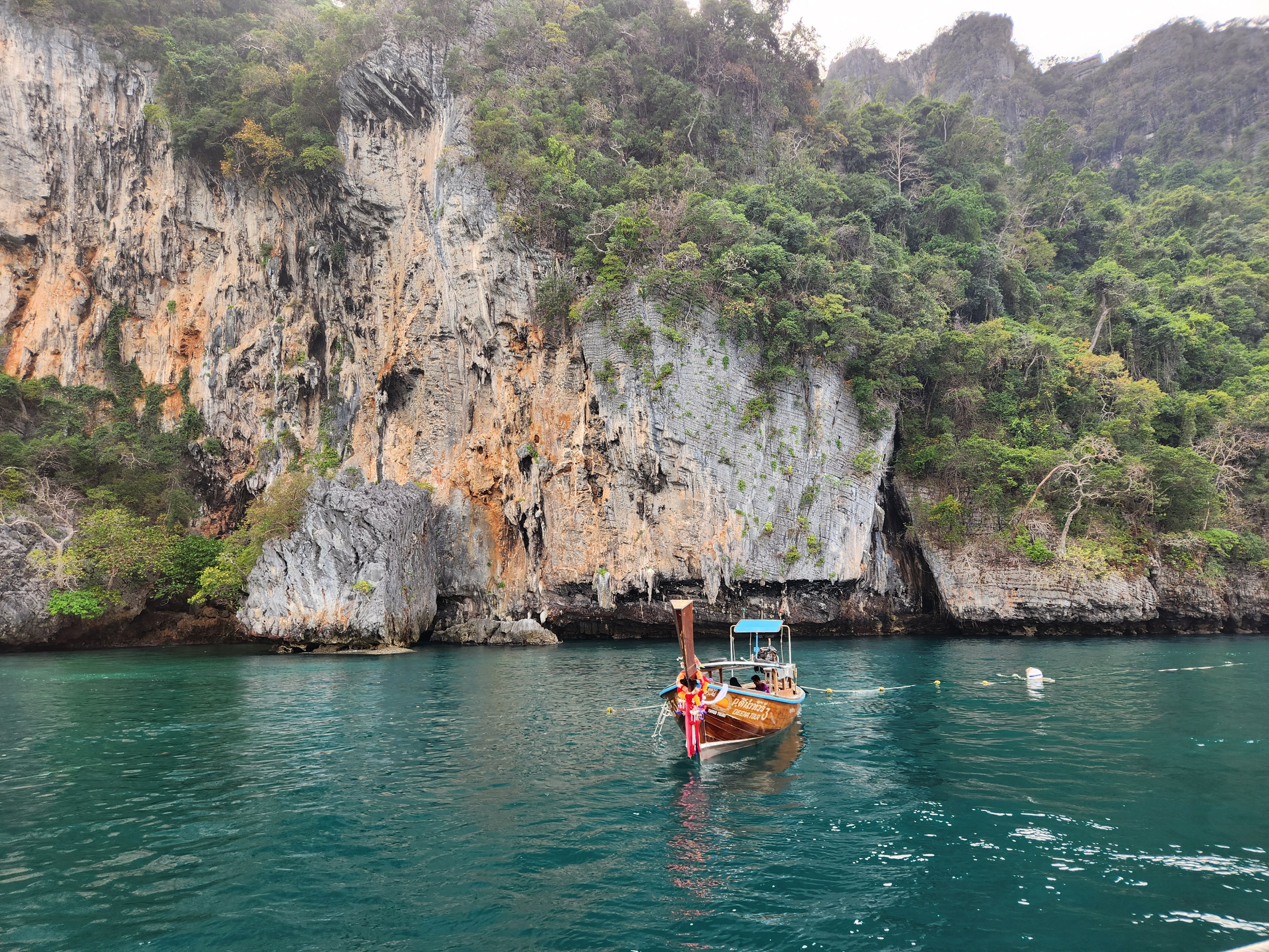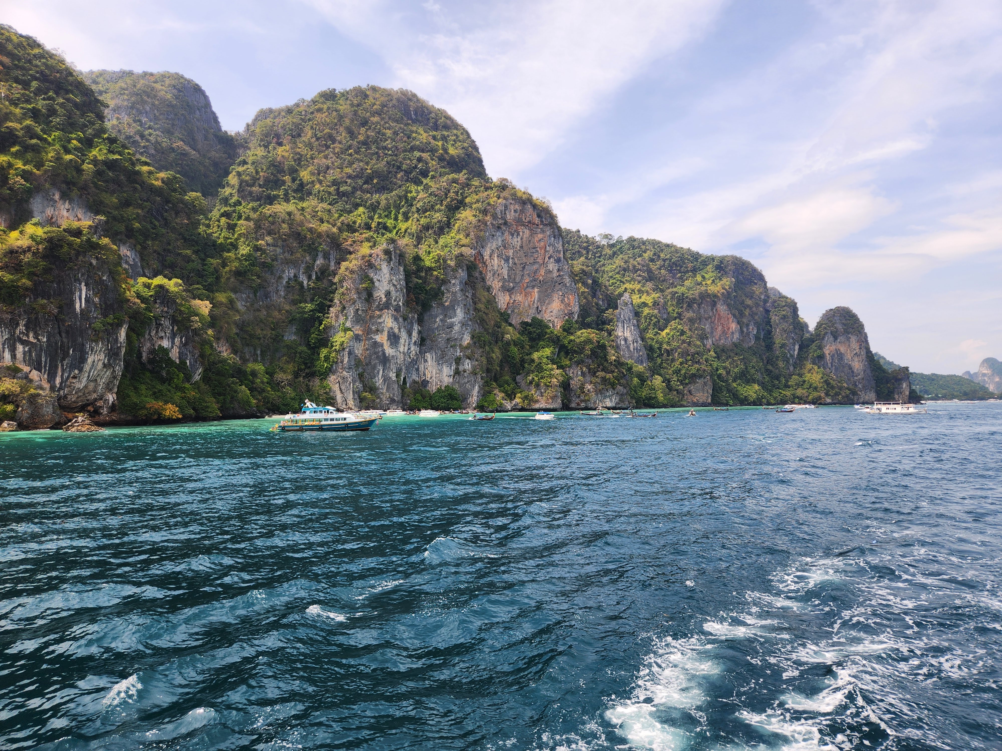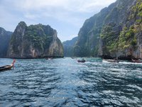 Lunch was served and we both enjoyed the offerings, and soon after we were at Koh Phi Phi Leh, home to Maya Bay. The catamaran dropped its anchor in the deep water and we were allowed to swim, snorkel, or paddle around. The limestone karsts rose up around us like highrise buildings which was impressive. The iconic half of Maya Bay was roped off to prevent traffic (boat and human) from getting too close to the beach, as its popularity due to the movie The Beach, had caused over tourism and the health of the reefs, water, fish, and entire bay had suffered. A revitalization project had been started in 2018 which actually closed off the area entirely to tourists while the area could be nursed back to health, and it was eventually reopened in 2022 with much stricter rules and regulations about its access in place.2