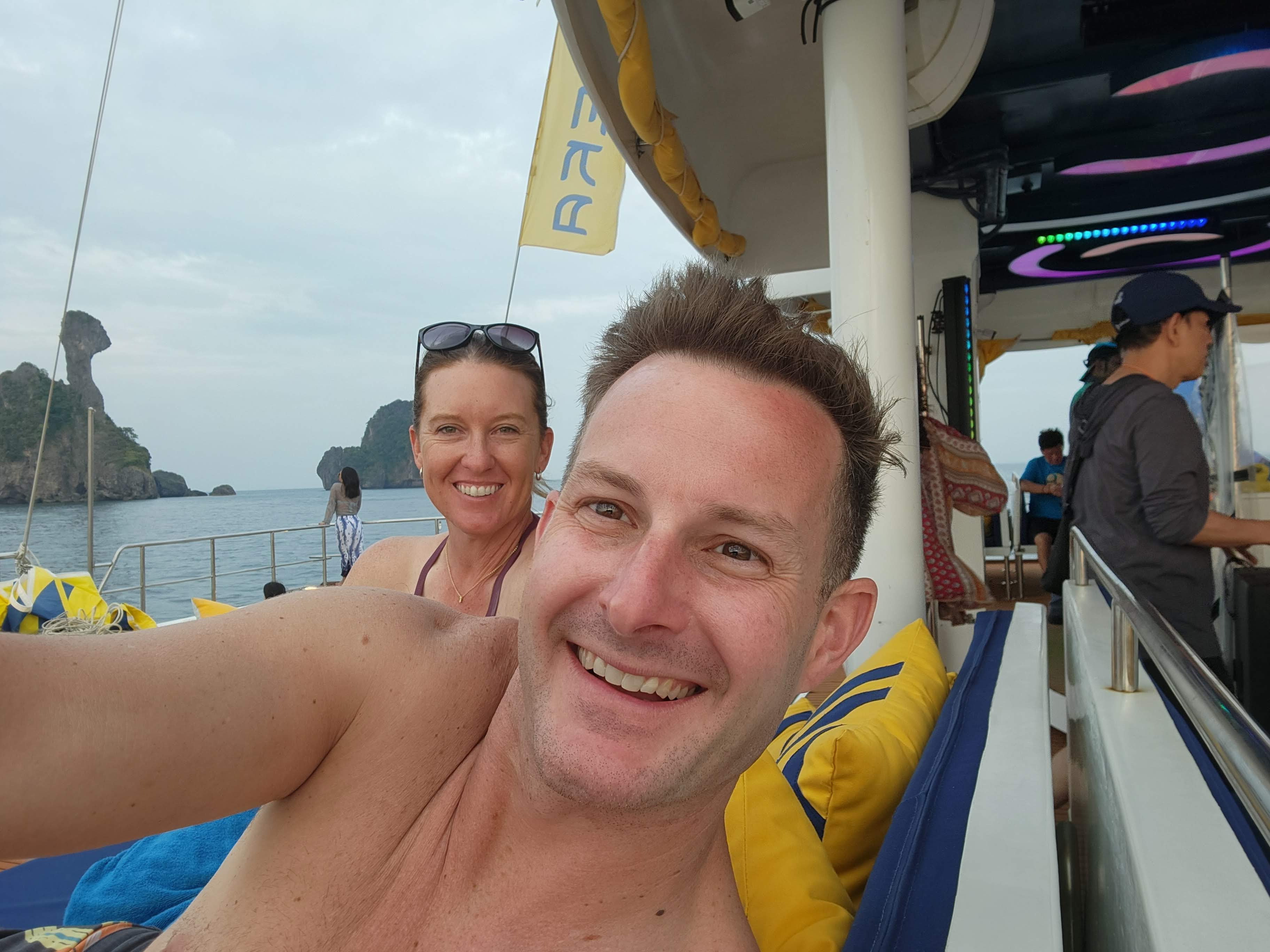 Scott and I had an all day catamaran cruise planned for today and couldn’t wait to see the famous and iconic Phi Phi Islands that we would be sailing around. The company we chose was called Meka Catamaran. They would be providing lunch, afternoon tea, and dinner, a live DJ, and provided all the equipment/toys/gear for entertaining us at the various stops. The highlight of the trip would be a stop at Koh Phi Phi Ley, where the 2000 movie The Beach was filmed. The company offered pickup and drop off service which was nice and would be picking us up this morning to take us to the boat.