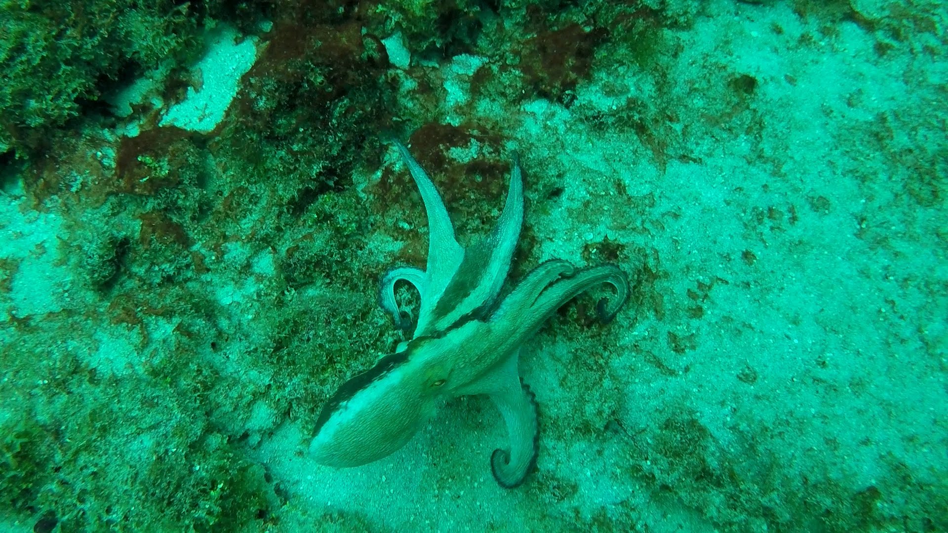 While I was teaching the morning sessions he went on his last dive at the Fredriksted cruise pier and it turned out to be his best and favorite one of the week. He was out for a little over an hour and came across a puffer fish and a little sea turtle that was perched atop some coral on one of the pier piles sleeping. His most exciting discovery of the dive was a trio of octopuses and he was able to watch them for a few moments, fascinated by their ability to change their color on demand to correspond with their surroundings as they glided around the seafloor.