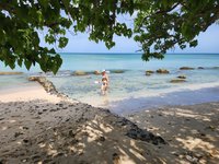 So after enjoying one last coffee time on the hill overlooking the Caribbean, Scott dropped me off at Rainbow Beach with my beach bag, colander, and the hammock, and headed to William’s field to shoot. I spent the morning floating and glass hunting, savoring the last few moments of island beachtime before we would head back to SC.