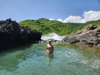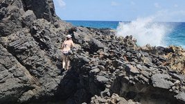 The pools were teeming with aquatic life, a micro-ecosystem at play, and we saw several species of fish and sealife, but luckily didn’t see the venomous sea snakes that some people have reported spotting in the pools. We enjoyed swimming and exploring and made our way to each of the pools in the series. We stopped at one that had the most clear opening to the sea and sat on the boulders and periodically got soaked by waves as they crashed against the rocks spraying surf that rose up several meters into the air and deposited more water into the pools. It was reminiscent of our trip to the Queen’s Bath in the Mokes in Oahu.