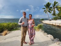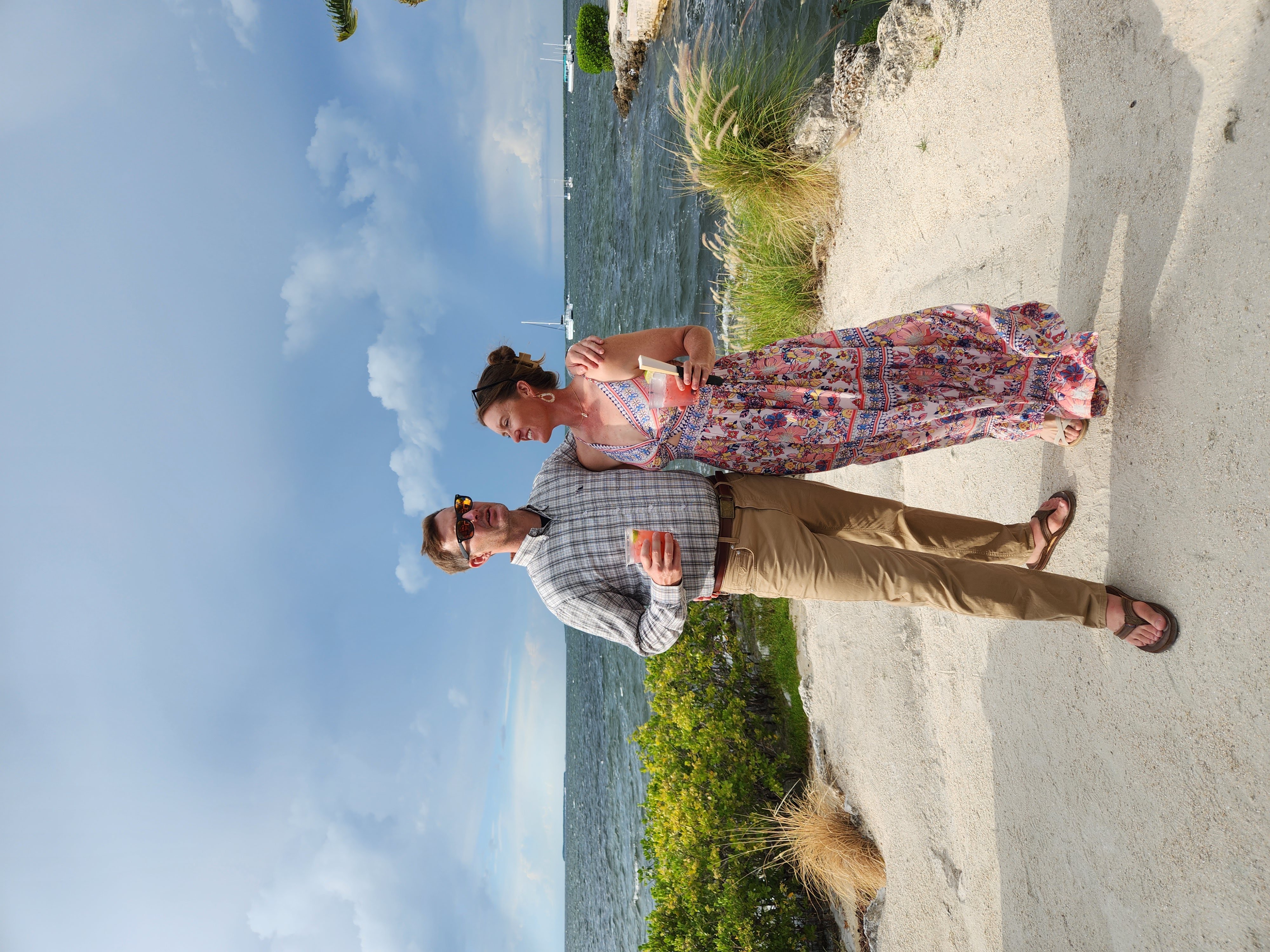 We had a little time before we needed to shower and get dressed for the wedding so we decided to take out one of the kayaks that we had access to with our rental. We decided on the tandem kayak and I was surprised when we were able to both lower ourselves down into it off the dock successfully without capsizing it. We (and by “we” I mean mostly Scott) paddled our way out of our marina’s channel and into the bay. The bay was protected on three sides by mangroves and made a protected area for anchoring boats. We paddled around the area for a while and observed some of the boats before hopping out of the kayak and taking a little float next to it. The water was surprisingly shallow and the sand was unpleasantly squishy, reminding me of Lake Hartwell’s muddy base as it squished between my toes so I didn’t spend much time out of the boat. We decided to head back in and we were now paddling against the current so I actually helped Scott paddle this time. We disembarked from the kayak and climbed back up onto the dock surprisingly easily, again not capsizing the boat.