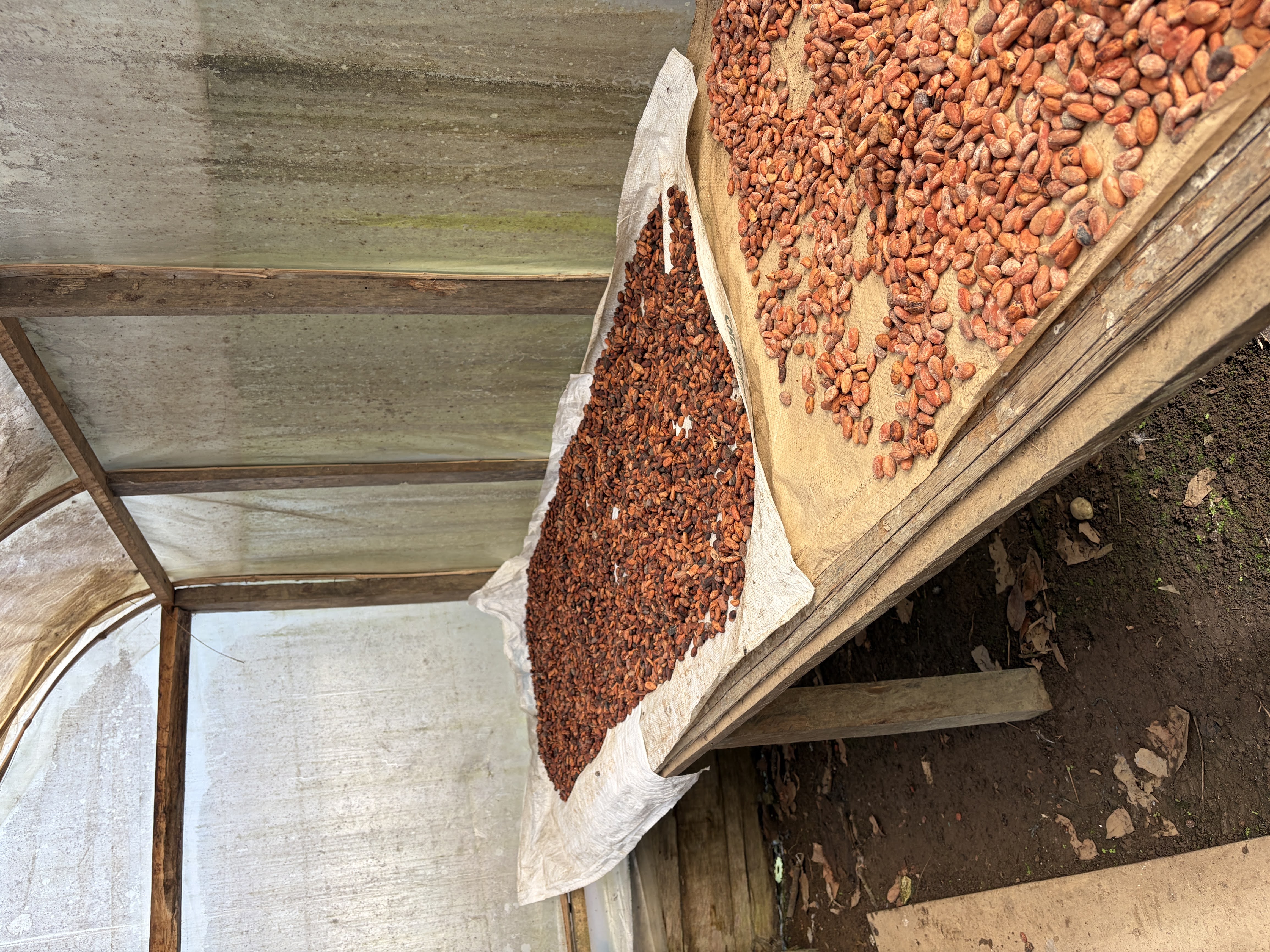 When we arrived, Carlos took us around the cacao orchard and we plucked off a few of the football sized bright red pods that were ripe and ready to be picked. He cut into one of them and had us sample the white pulpy seeds. They tasted literally nothing like chocolate, and instead had a tangy and almost citrusy or mango-like taste. We were instructed to eat the flesh but not the hard beans inside and to spit that part out and keep it. These beans go on to be laid out to ferment and dry for several days.
