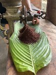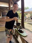 The next step was to put the nibs in a hand-cranked grinder and Scott was shown how to grind them down. The powder was collected in a banana leaf and was then processed through the grinder two more times. At this point it was ready to either be briefly frozen so that it formed a patty of sorts, or could be added to hot milk with some cinnamon to make Ecuadorian hot chocolate. Half of the powder was put in the freezer on the banana leaf, and Carlos took the other half to make the hot drink for us. He had snapped a twig off a cinnamon tree in the orchard and then used a knife to scrape off some of the bark into the saucepan as he stirred the cocoa powder into the hot milk.