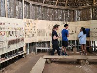 The last phase of our Amazon experience was a trip to visit the village of an indigenous community, the Amazonian Kichwas. No offense to the Kichwas, but the experience felt much like visiting the Oconoluftee indian village in Cherokee, NC. A little contrived. There was a song and dance exhibition where their village grandpa was told to go out and bang his drum for a bit and march around the thatched roof hut for the tourists, followed by a girl that made the rounds passing out community hooch, or chicha from a wooden bucket.